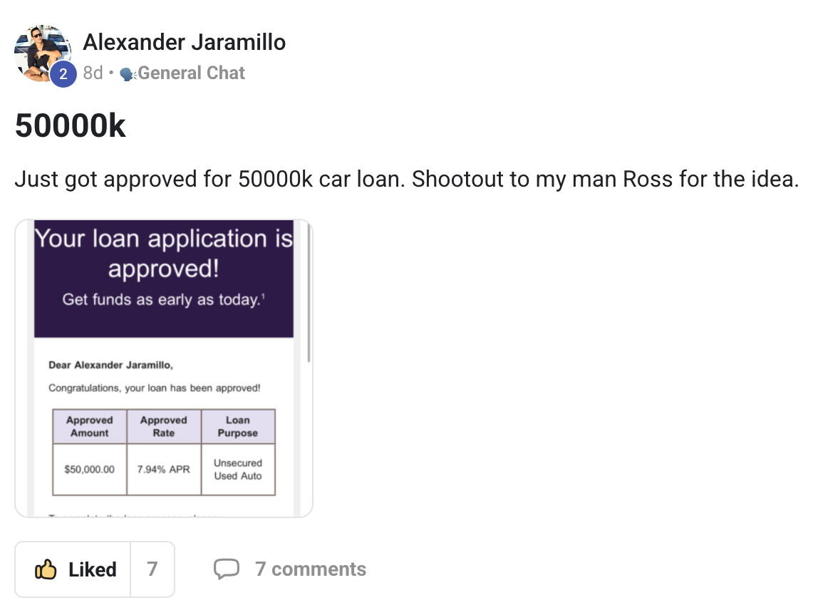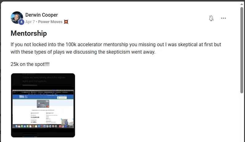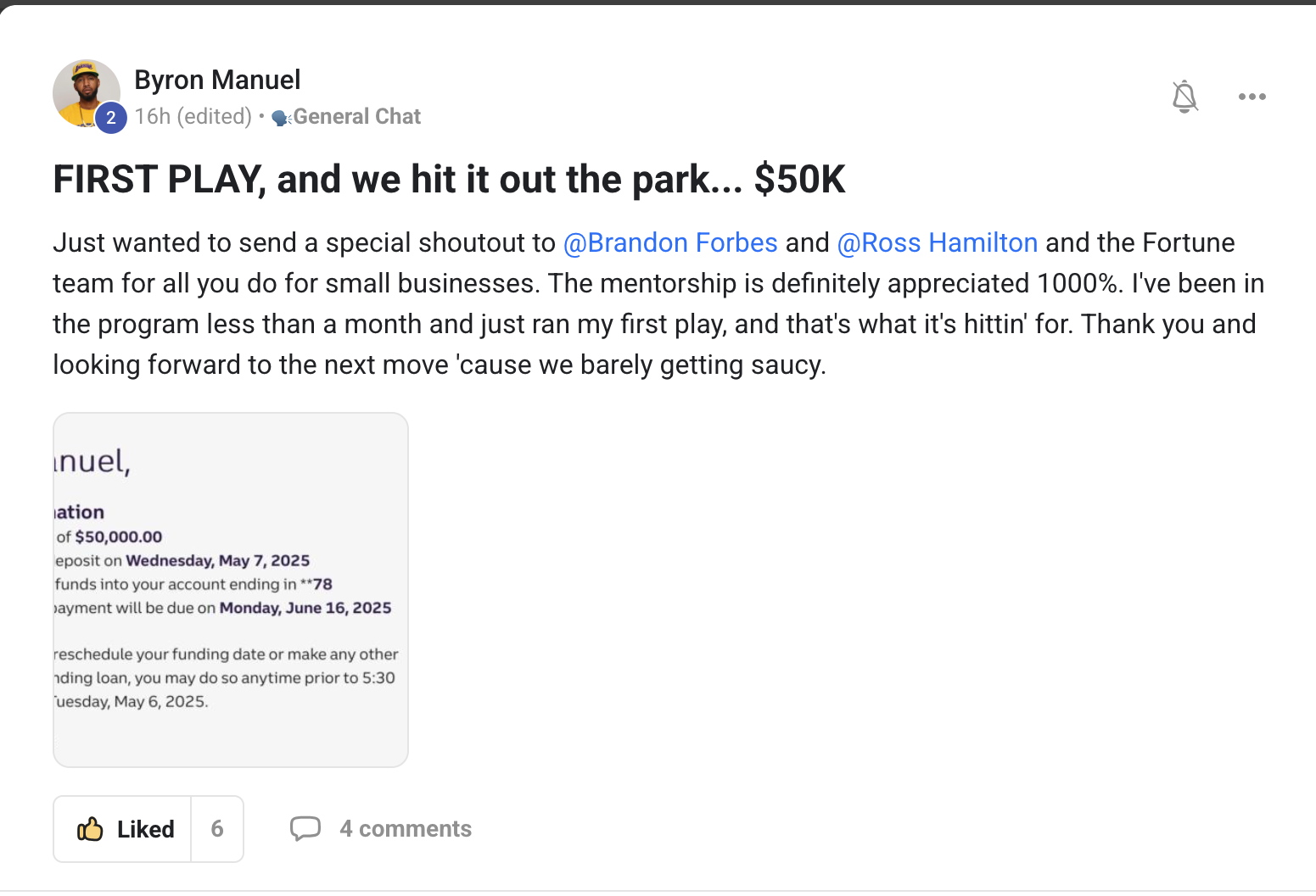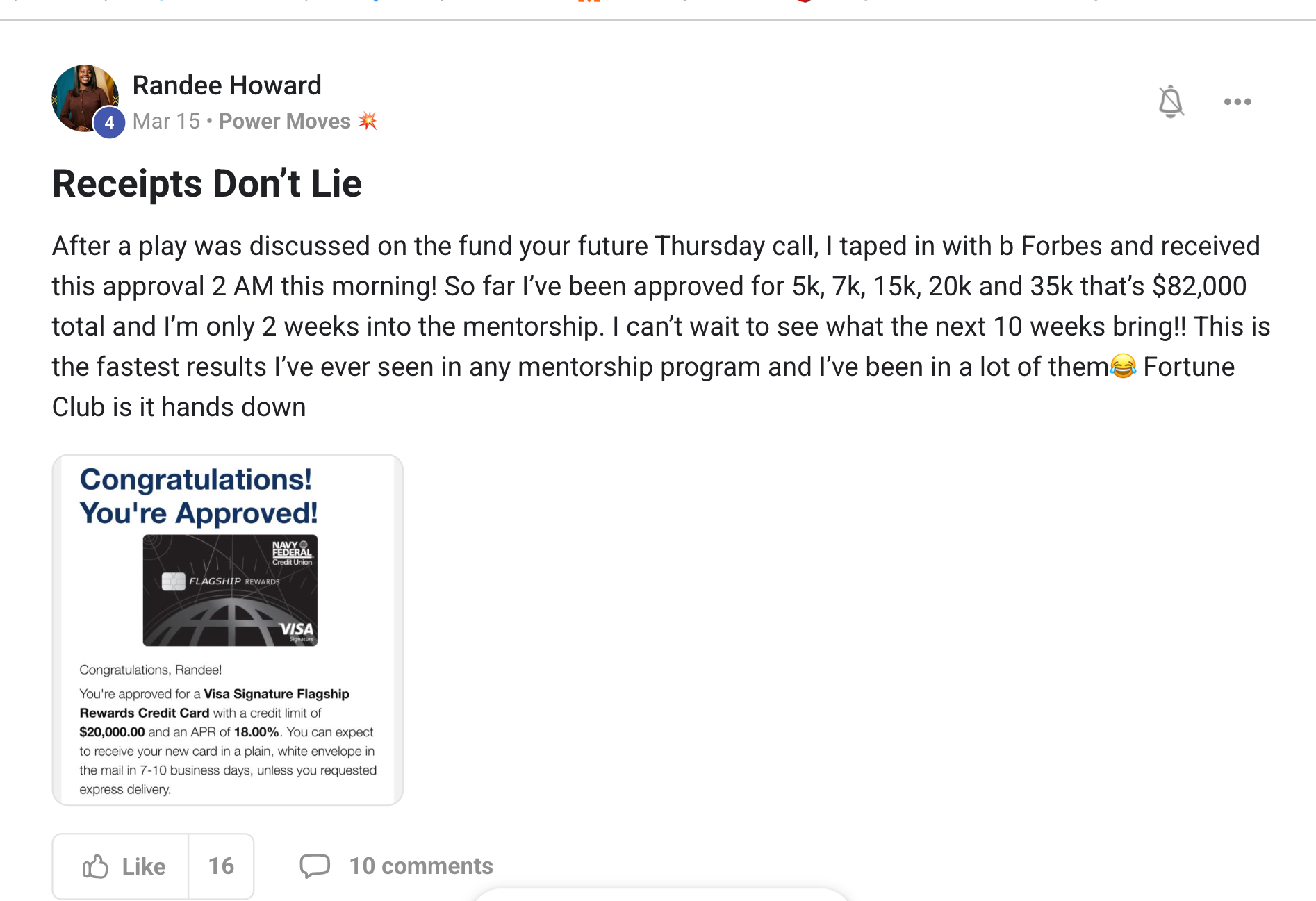 "So far I’ve been approved for $5K, $7K, $15K, $20K, and $35K — $82K total and I’m only 2 weeks into the mentorship. This is the fastest funding I’ve ever seen!"