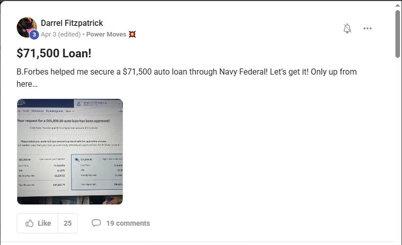 "Let’s get it! Only up from here… B. Forbes helped me secure $71,500 through Navy Federal."