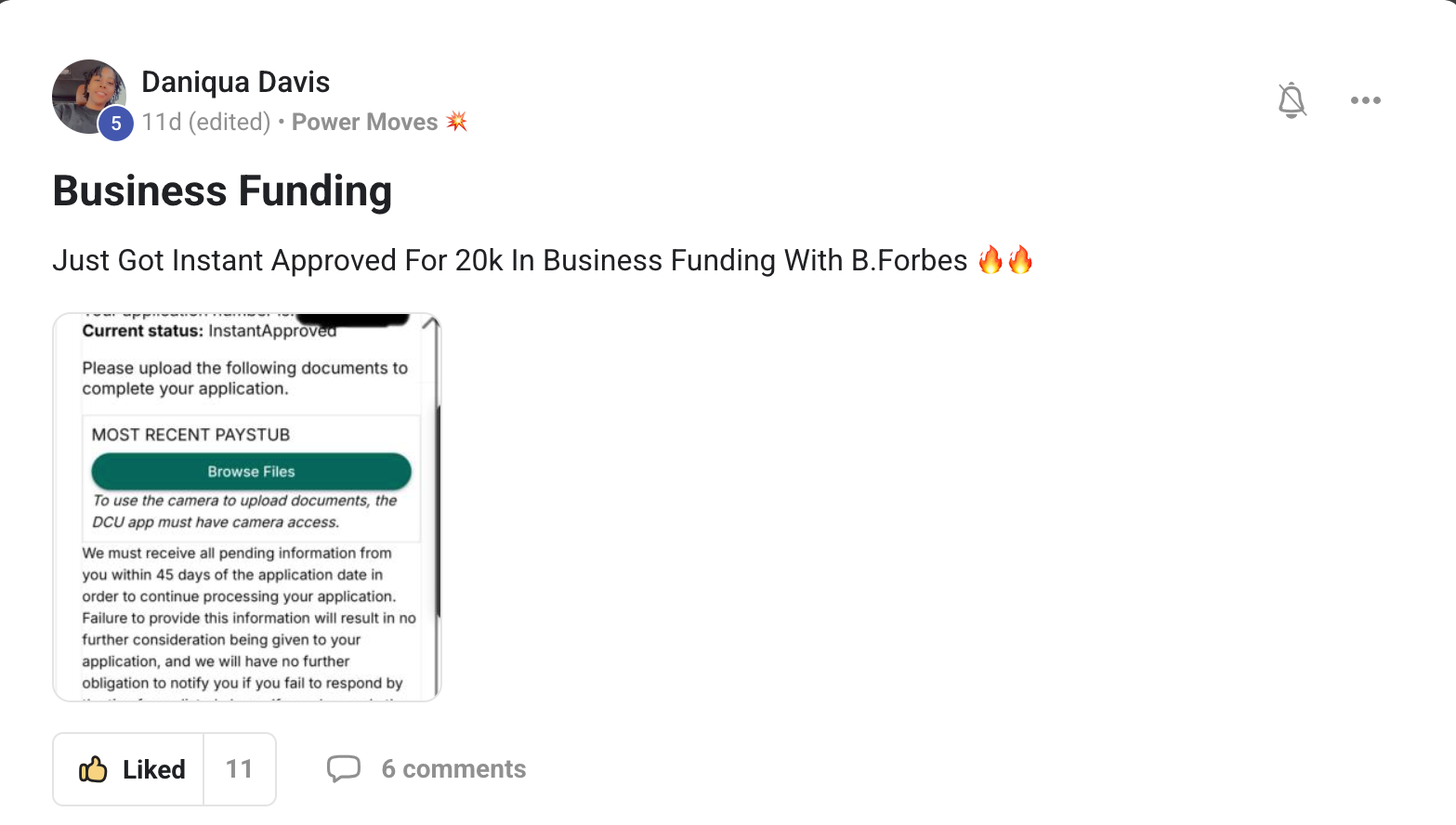 "Just got instant approval for $20K in business funding. B. Forbes does not play!"