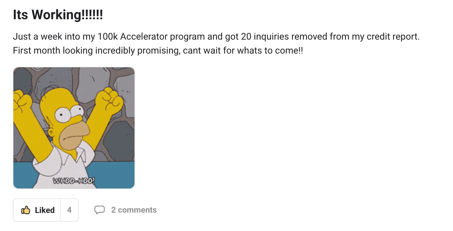 "Just a week into the 100K Accelerator program and 20 inquiries were removed from my report. Big things ahead."